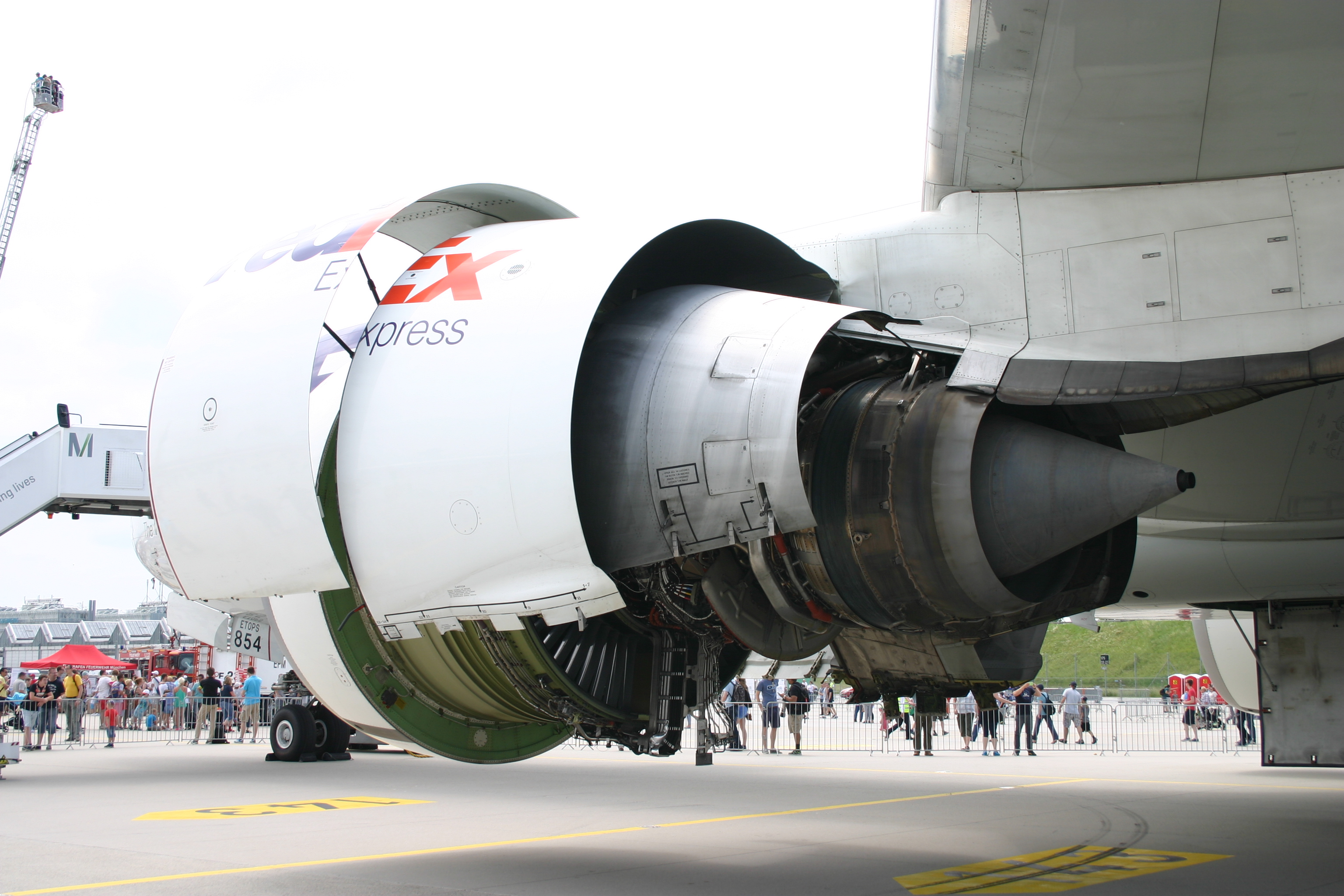 geöffnete Triebwerksverkleidung einer Boeing B777 der FedEx