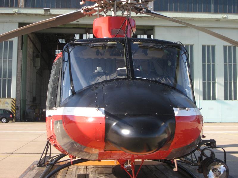 Die Frontansicht eines Bell UH Rettungshubschraubers. Die Maschine wird von zwei Piloten geflogen.