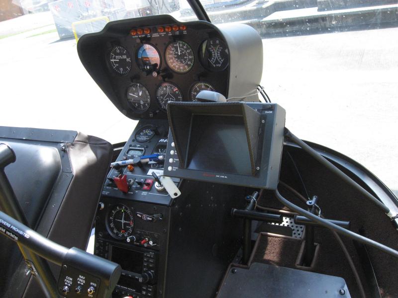 Nochmal anderer Blickwinkel in das Cockpit des Robinson R 44 Hubschraubers.