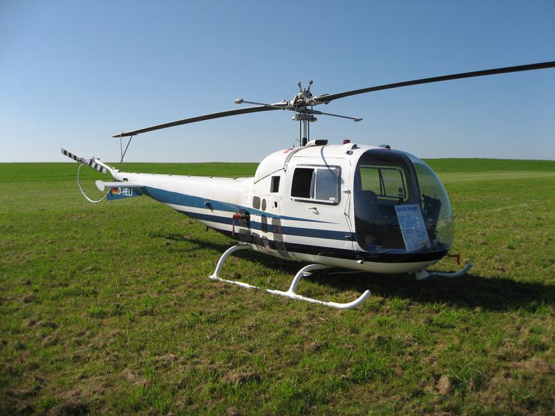 Eine Bell 47 D Ranger. Diese Maschine hat einen zentralen Platz vorn für den Piloten und eine Sitzbank für drei Passagiere dahinter.