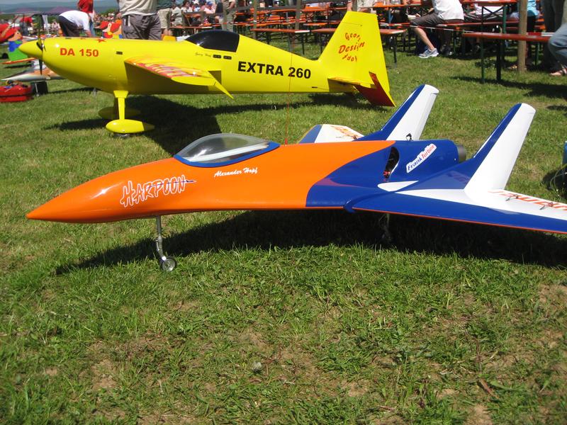 Jet Modellflugzeug Harpoon, dahinter ist ein Kunstflugzeug vom Typ Extra 260 geparkt.