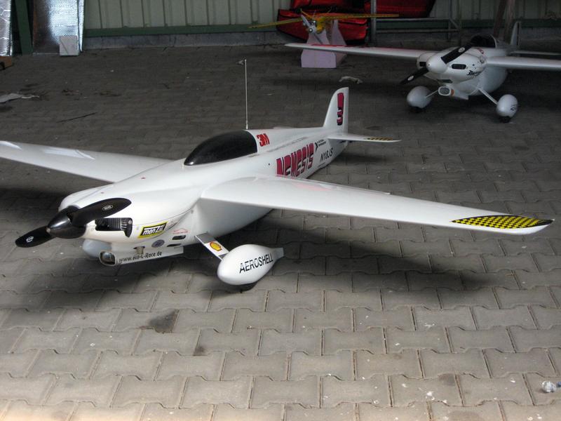 Zwei Modelle eines Rennflugzeugs stehen in unserem Hangar.