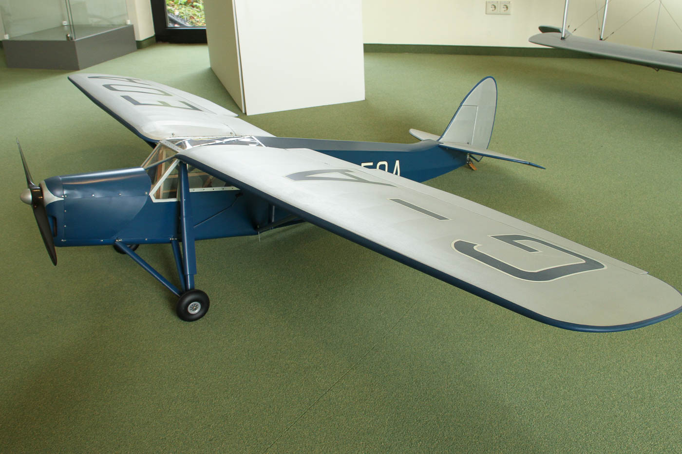 Modell De Havilland D.H. 80 Puss Moth im Maßstab 1:5. Das Original wurde als Privatflugzeug bis 1934 284 mal gebaut, das Modell ist der genaue Nachbau eines Exemplars von 1931, welches bis heute mit diesem Kennzeichen und dieser Farbe in England flugfähig gehalten wird.