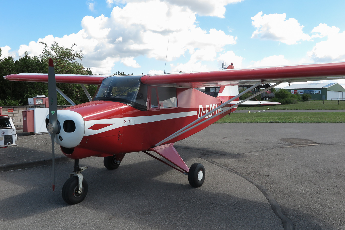 Flugplatz Bad Neustadt - Grasberg am 10.8.2024, Oldtimer Piper PA 22 neben der Tankstelle