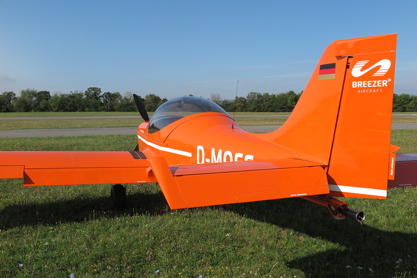 Flugplatz Bad Neustadt - Grasberg am 20.8.2024, Heckansicht einer orangen Breezer