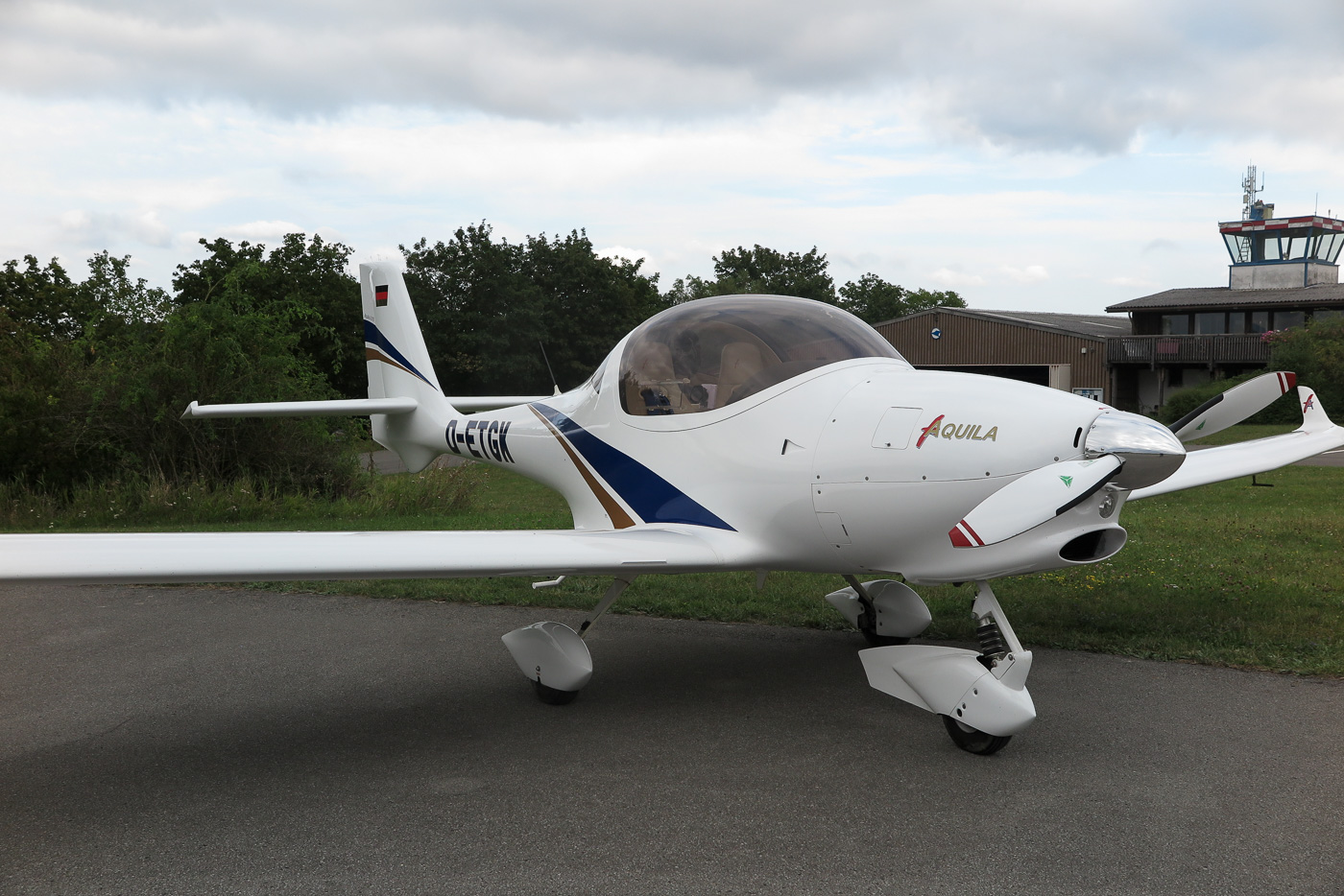 Flugplatz Bad Neustadt - Grasberg am 20.8.2024, Aquila A210 neben der Tankstelle