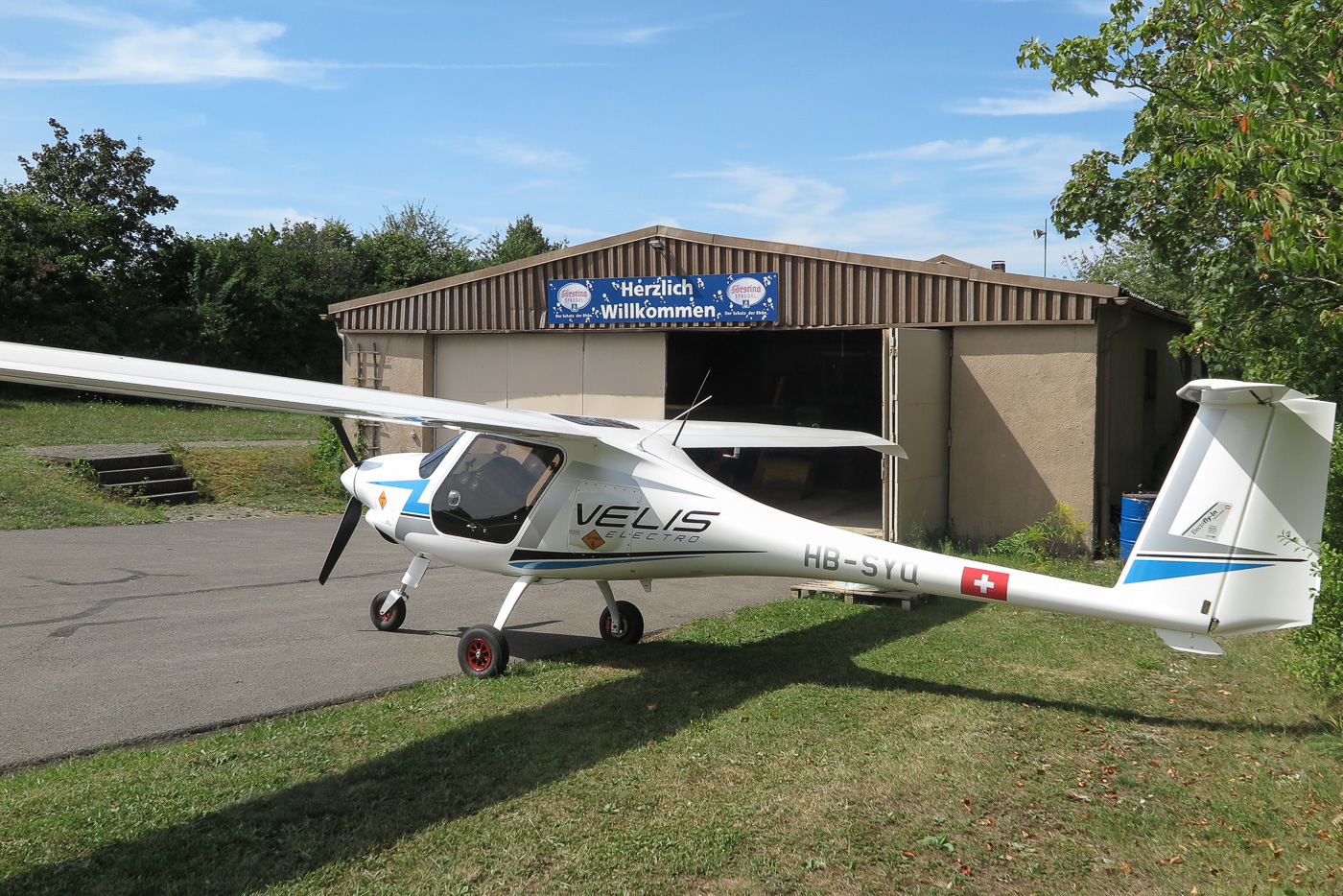 Flugplatz Bad Neustadt - Grasberg am 22.8.2024 serienmäßig hergestelltes Elektroflugzeug zum Laden an der alten Halle