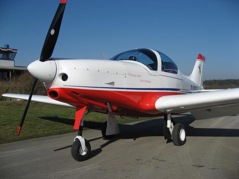 Das high-end Ultraleichtflugzeug Pioneer 300, welches von der italienischen Firma Alpi Aviation gebaut wird zwischen Clubheim und grüner Flugzeughalle auf dem Flugplatz Grasberg in Bad Neustadt.