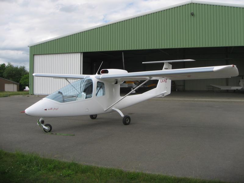 Das Kitflugzeug Sky Arrow vor unserer grünen Halle.