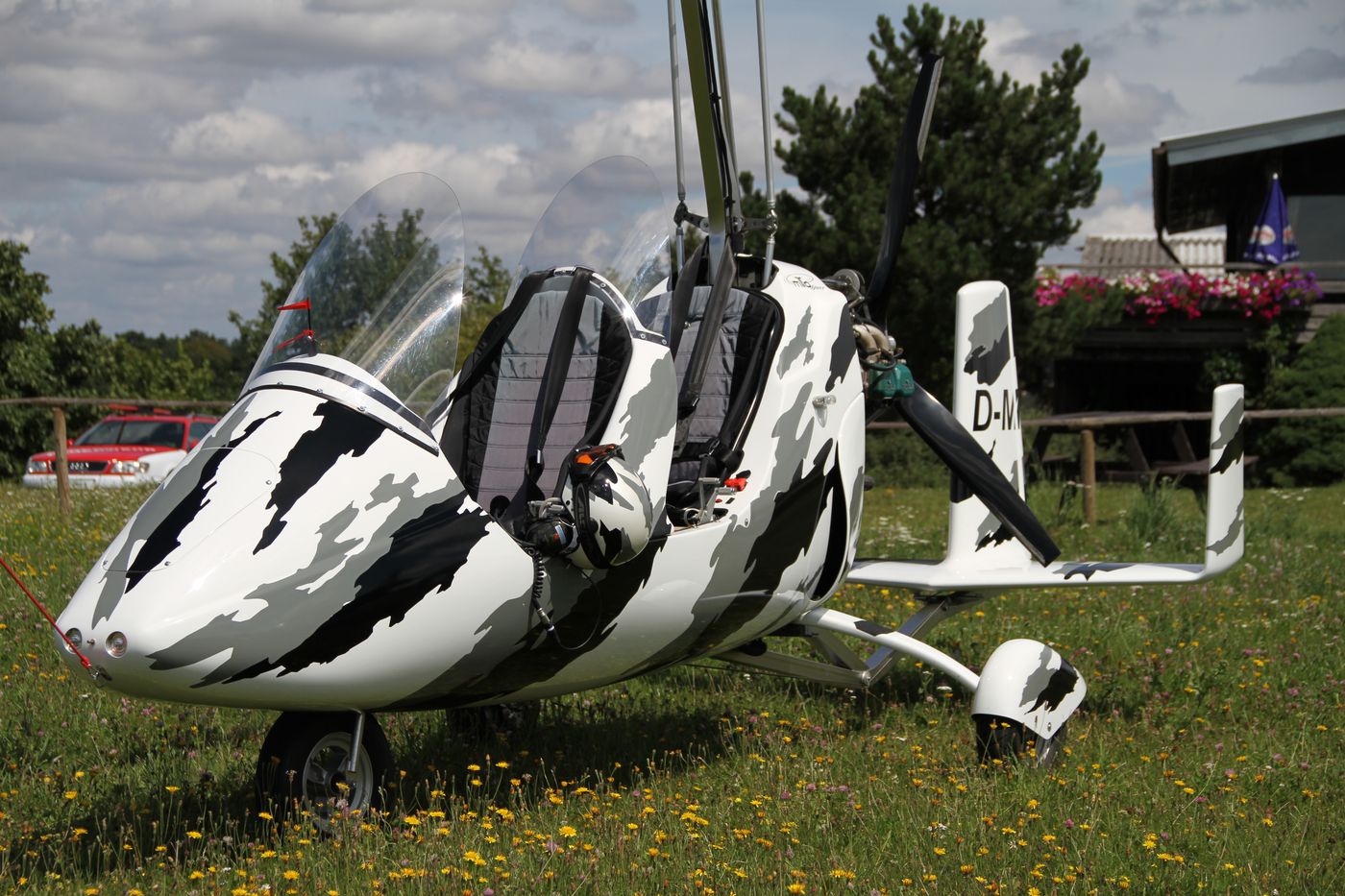 Gyrocopter auf dem Grasberg, sogar der Helm ist im Zebralook
