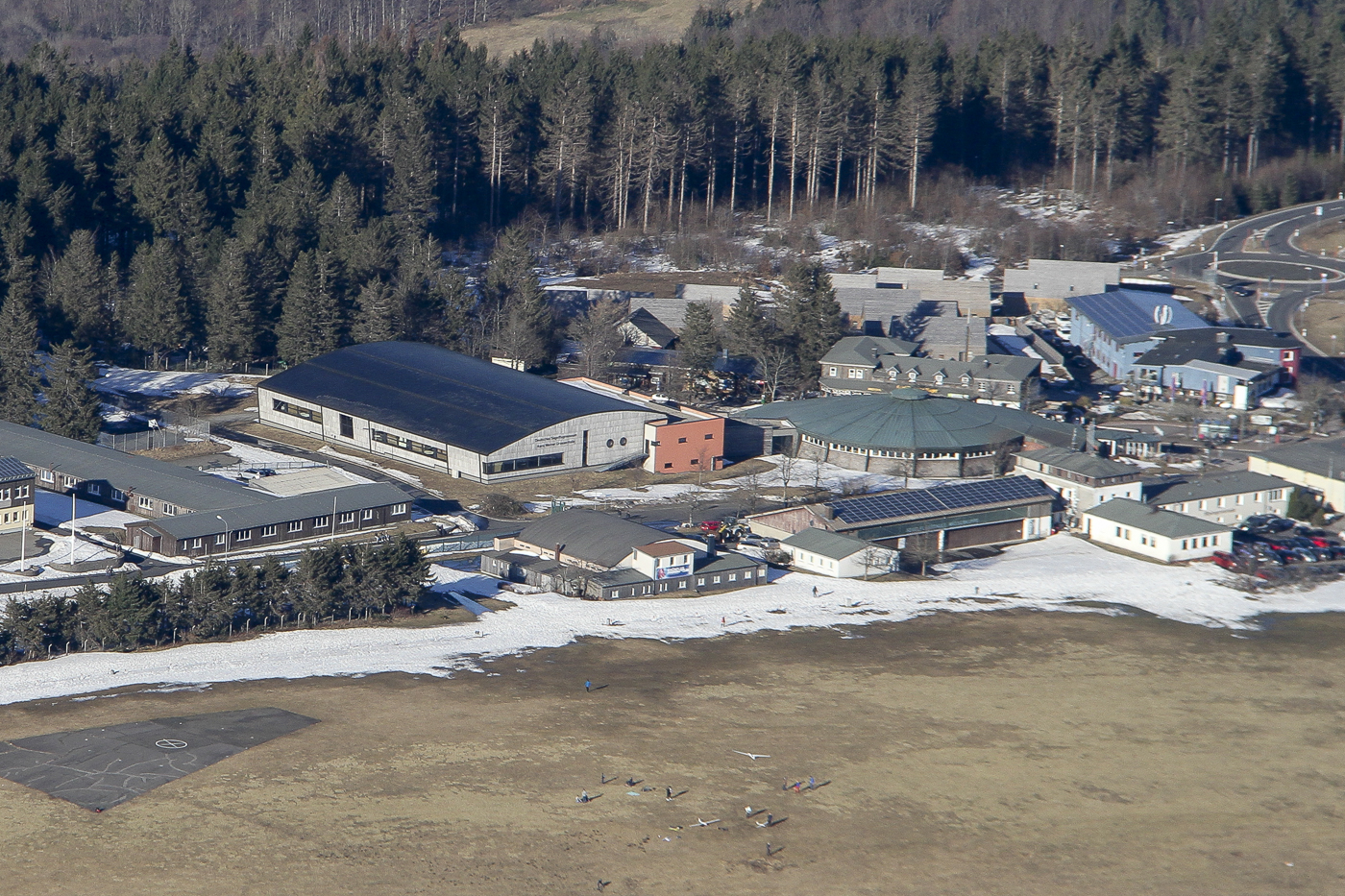 Luftbild Wasserkuppe am 21.2.2021 mit Deutschem Segelflugmuseum in der Bildmitte und Modellfliegern am Bildunterrand