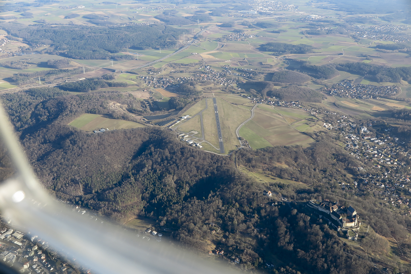 Luftbild am 28.02.2021, Flugplatz Coburg und Festung aus dem Motorsegler fotografiert