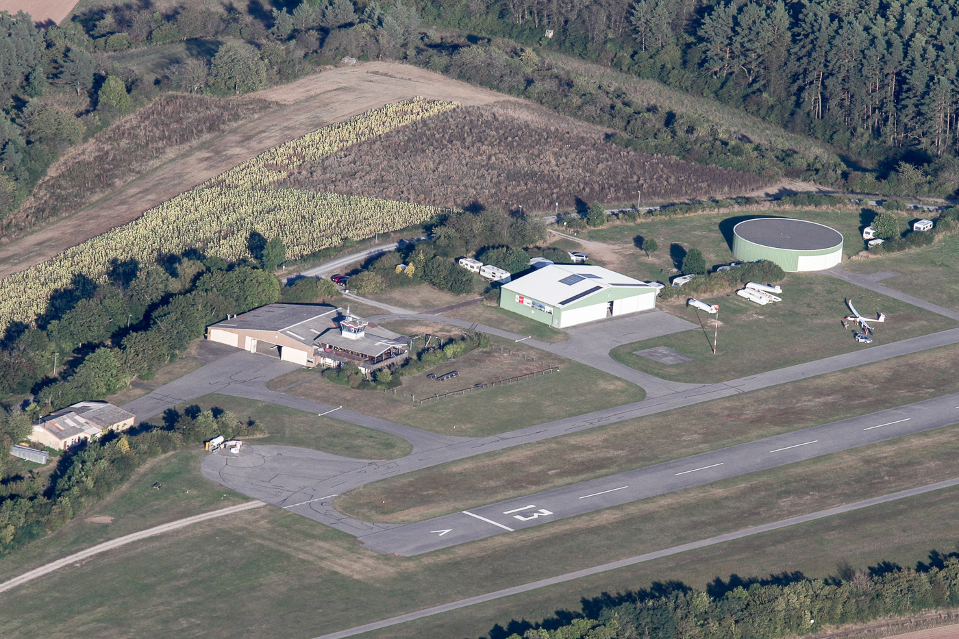 Luftbild am 28.08.2024, die Gebäude am Flugplatz Grasberg (Bad Neustadt)