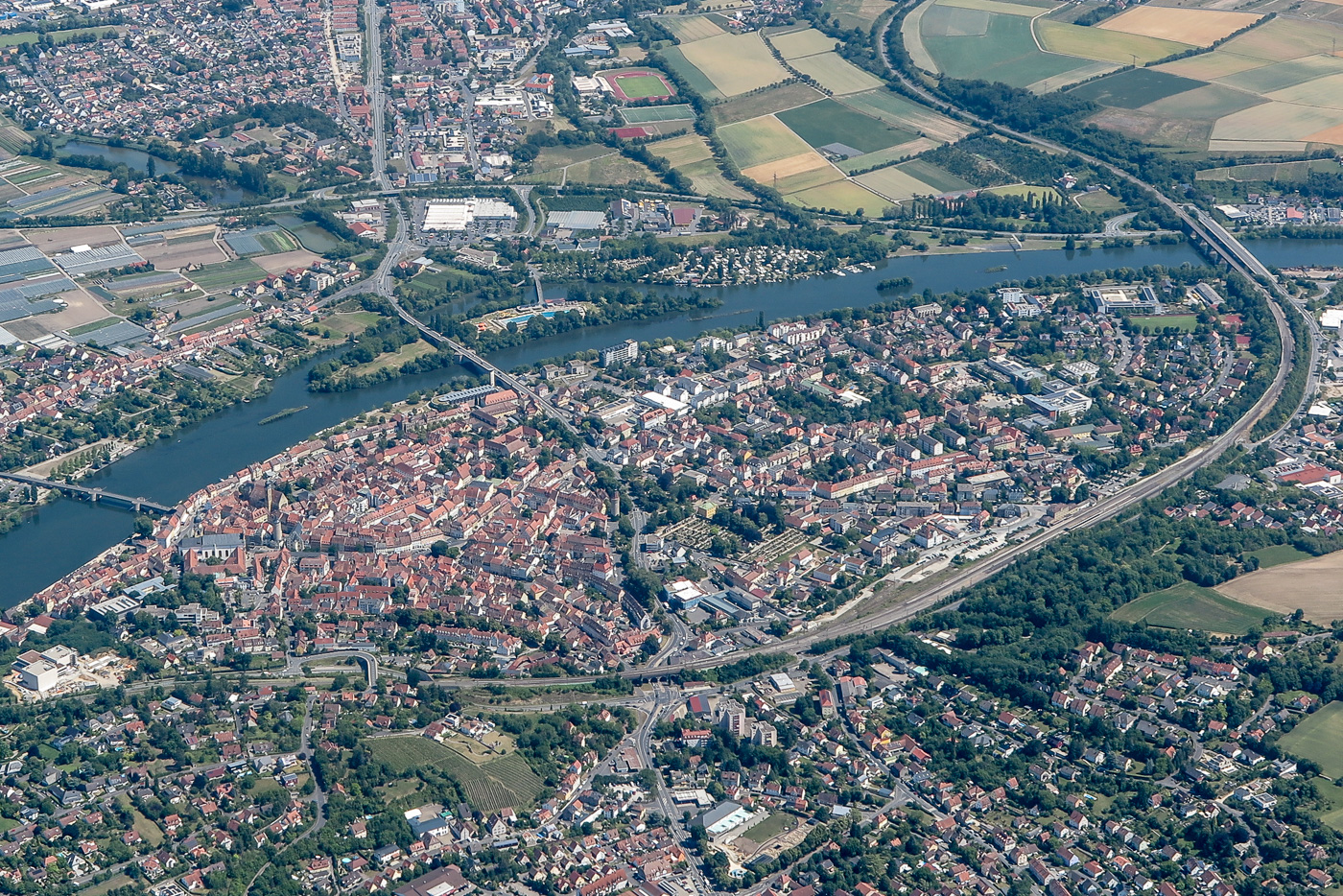 Luftbild Kitzingen am 21.6.2025, Altstadt mit Umfahrung