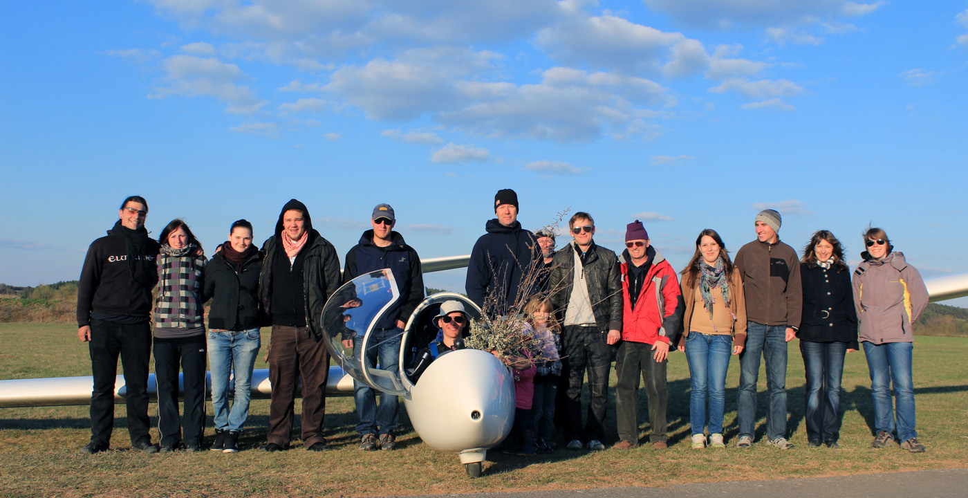 Glückwünsche und Gruppenbild zu Daniel's absolviertem ersten Alleinflug