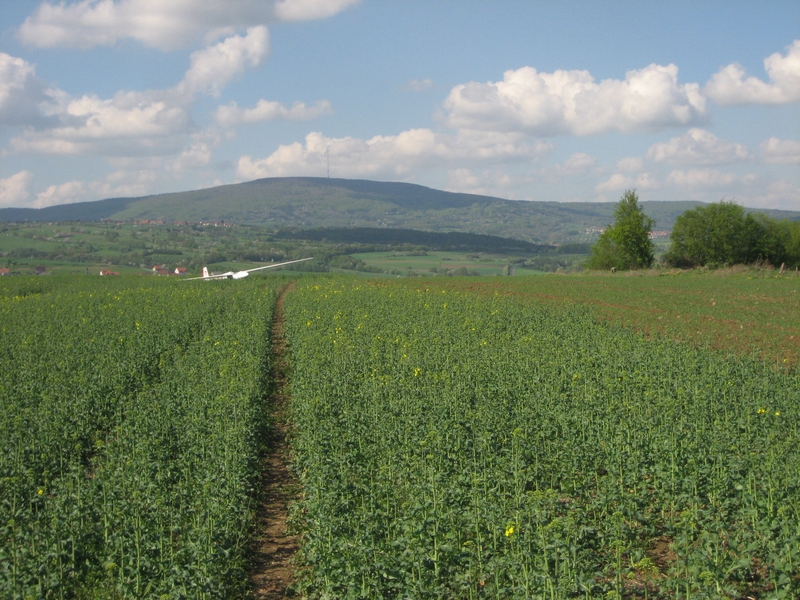 Acker im Vordergrund Kreuzberg im Hintergrund, weiter Flug bis zu dieser Aussenlandung
