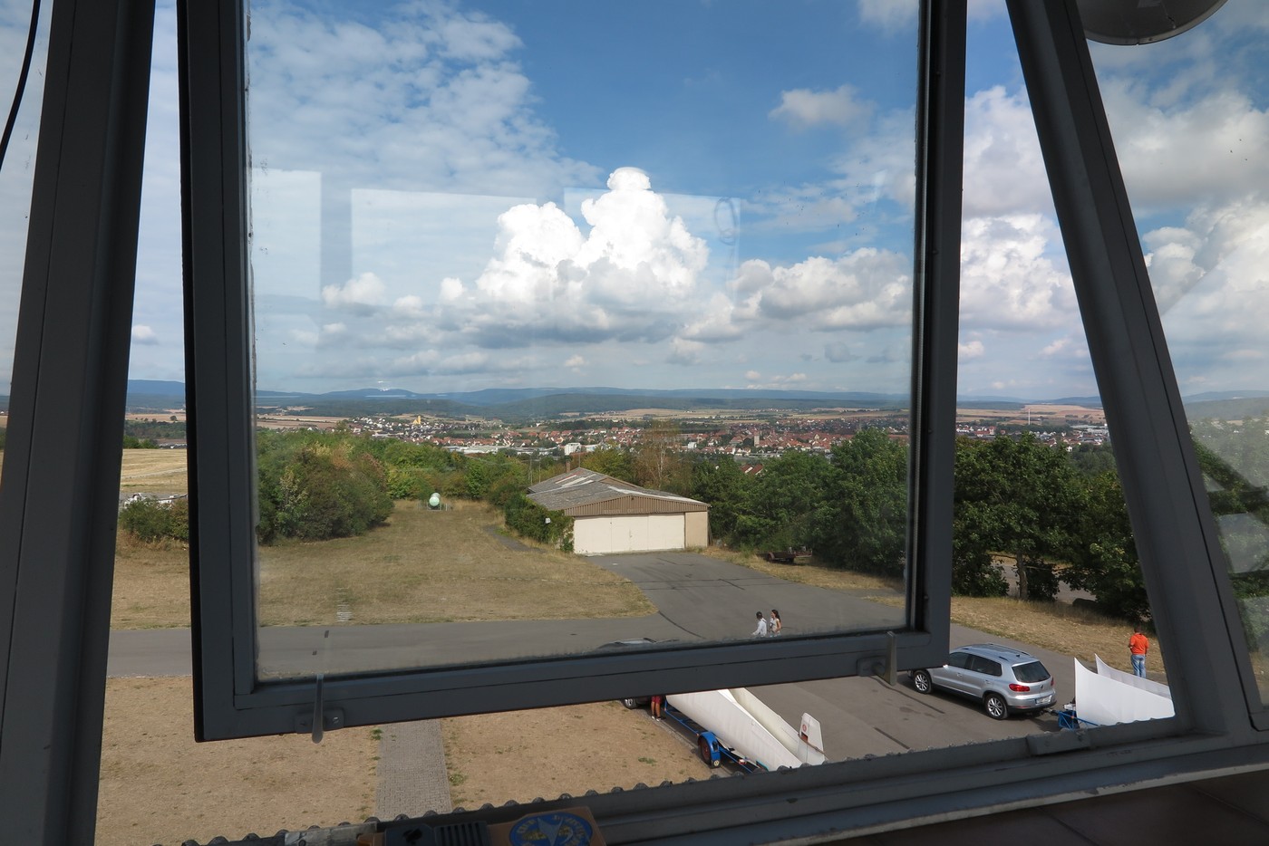 Flugplatz Bad Neustadt - Grasberg, Blick in Richtung Rhön beim Flugleiterdienst am 15.08.2015