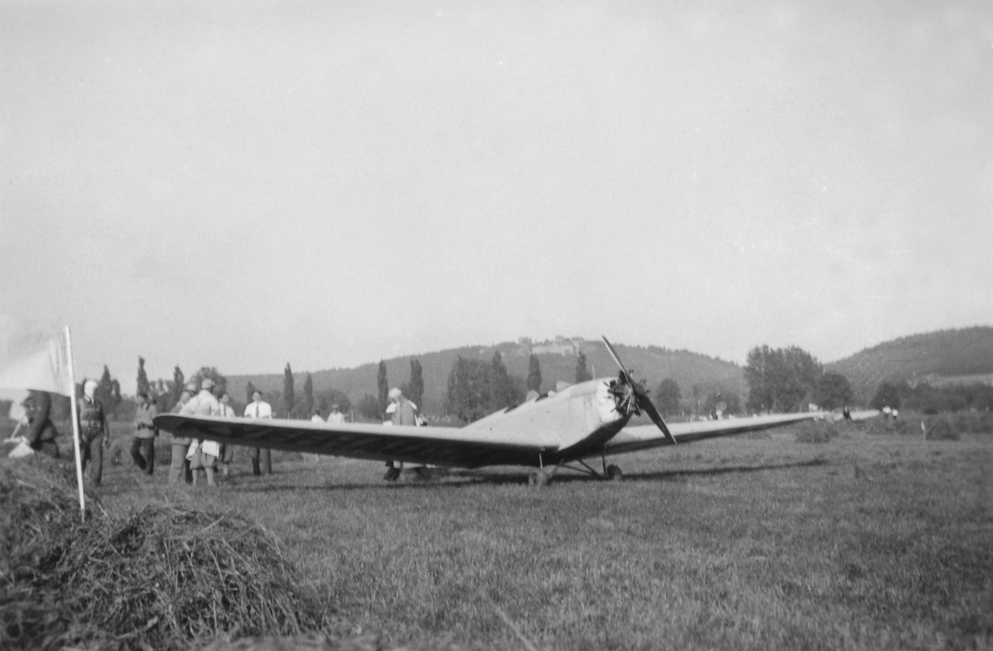 Kleines Motorflugzeug mit Tandemsitzordnung in den Saalewiesen (eine Klemm L 25), Aufnahme vermutlich in den 30ziger Jahren