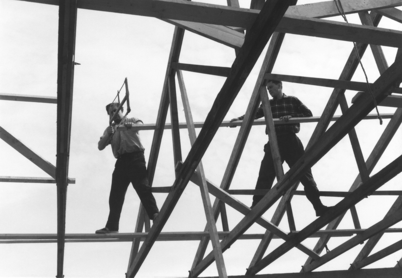 das Hallendach der heutigen Fahrzeughalle wurde offensichtlich in Eigenleistung erbaut, mit der Säge Eberhard Hanusch.