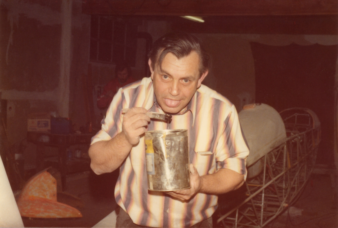 Eberhard Hanusch in einer Werkstatt mit Flugzeug (Tandemfalke), unbekannter Zeitpunkt in der alten Halle. Er kostet Klebelack.