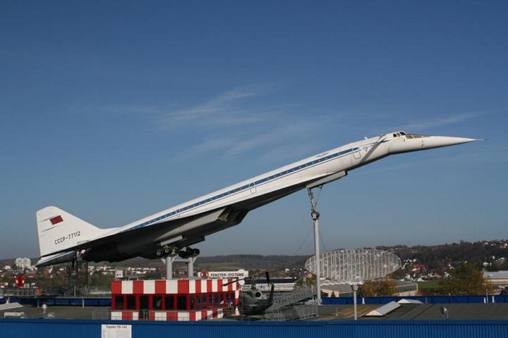 Das russische Überschallflugzeug auf dem Museumsdach in Sinsheim