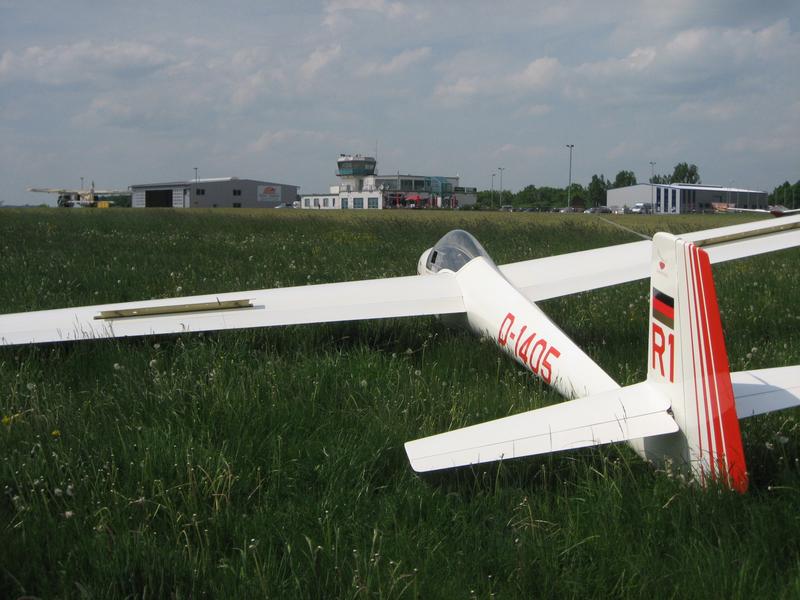 Die Klappenlibelle am Flugplatz Eisenach-Kindel, im Hintergrund sieht man das Vorfeld, den Turm und die Hangars.