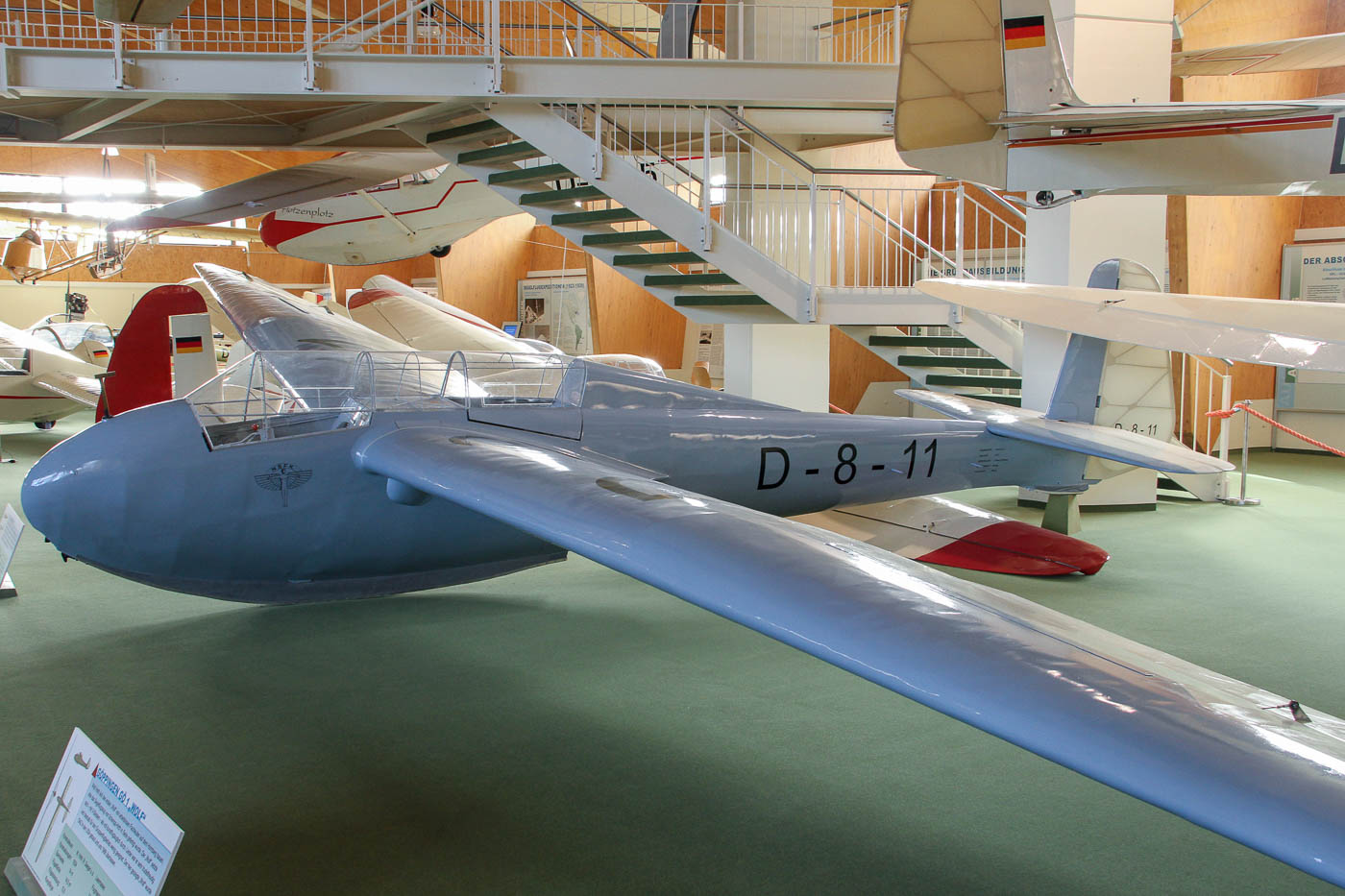 DFS Kranich II, ca. 2000 mal gebaut, Konstrukteur Hans Jacobs, Spannweite 18 m, Flügelfläche 22,68 qm, Flügelstreckung 14,3, Rumpflänge 7,75 m, Leermasse 270 kg, Flugmasse 450 kg, geringstes Sinken 0,7 m/s bei 70 km/h, beste Gleitzahl 24,3 bei 70 km/h, Vmax 175 km/h, heute auf 135 km/h reduziert.