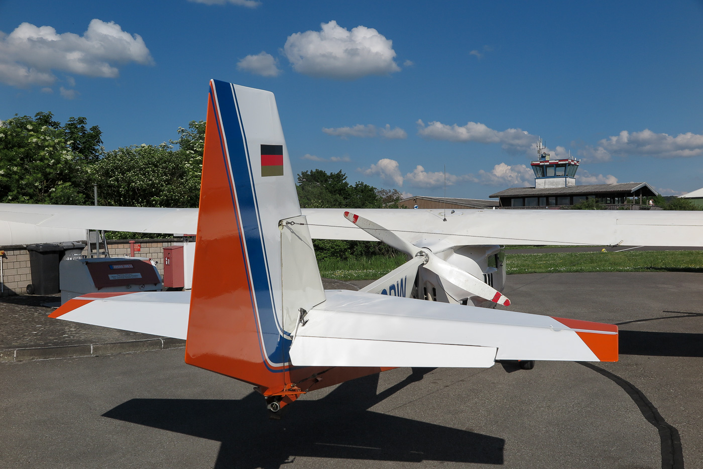 Flugplatz Bad Neustadt - Grasberg am 20.5.2024, Leitwerk eines seltenen Brditschka Motorseglers