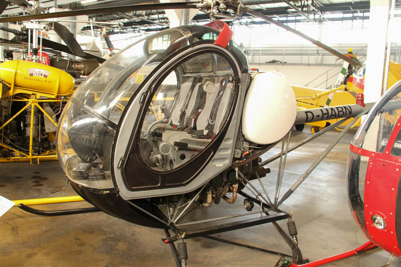 Hughes 269 A, der wurde bis Ende 2017 geflogen, Länge 9,4 m, Rotor 8,18 m, Reichweite 350 km, Dienstgipfelhöhe 3109 m, 180 km/h, Lycoming H10-360 Motor mit 141 kW, Baujahr 1978.