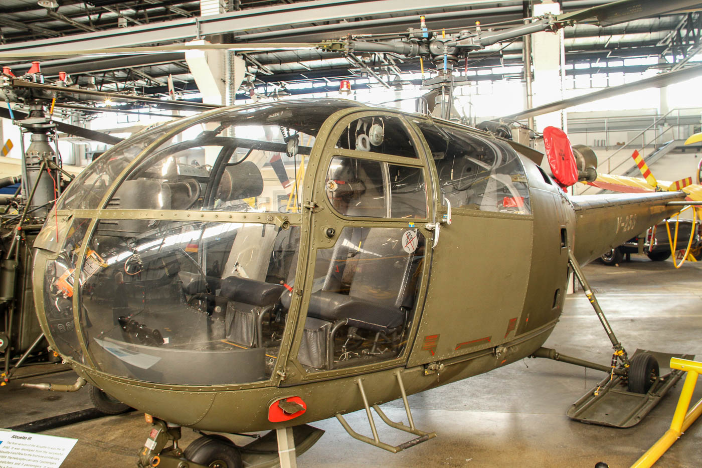 Alouette III, dieses Exemplar wurde vom Museum 2009 flugfähig erworben und 2009 per LKW ins Museum gebracht. Länge 12,9 m, Rotor 11,02 m, Leergewicht 1108 kg, Startgewicht 2250 kg, Reichweite 480 km, Dienstgipfelhöhe 3300 m, 200 km/h, Artouste IM B Turbine mit 405 kW, Baujahr 1974.