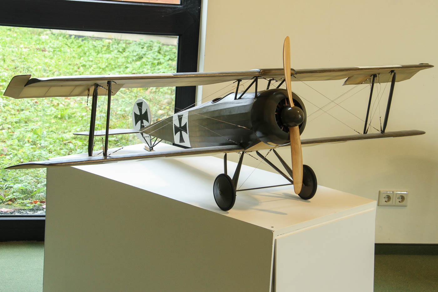 Modell Fokker D V im Maßstab 1:5. Das Original von 1916 hatte einen 100 PS Umlaufmotor, 1917 wurden 216 Stück gebaut, die wogen leer 363 kg und hatten eine Spannweite von 8,75 m.