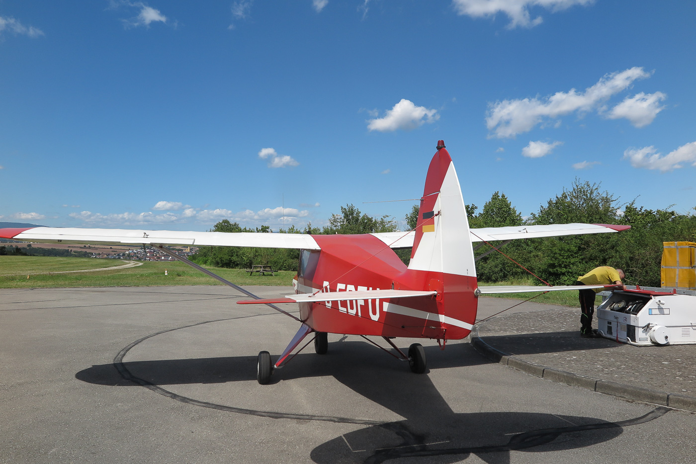 Flugplatz Bad Neustadt - Grasberg am 10.8.2024, Heckansicht der zweisitzigen PA 22