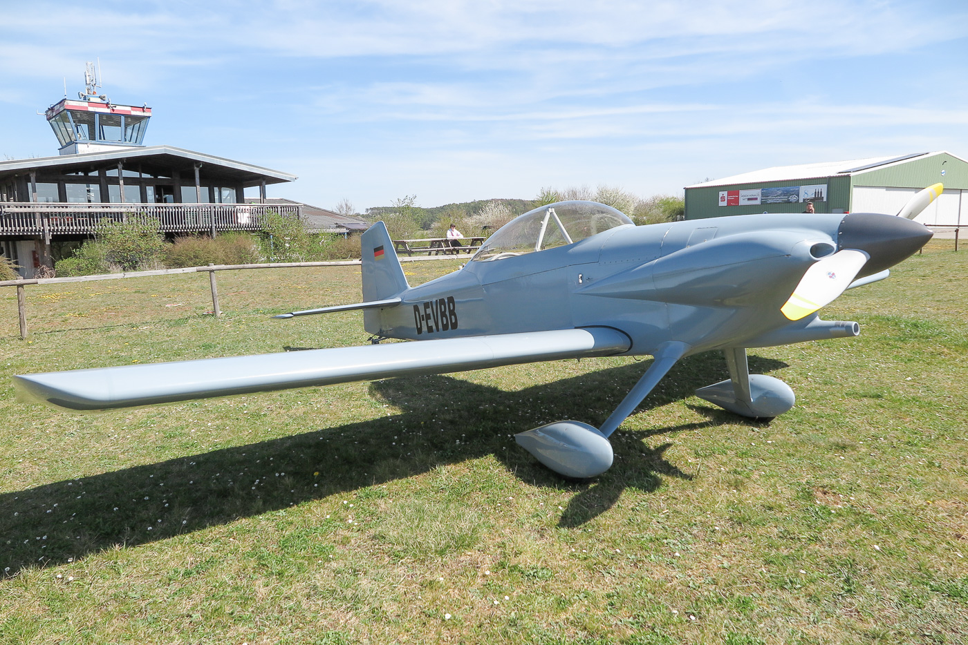 Flugplatz Bad Neustadt - Grasberg am 12.4.2025, RV-4 geparkt vor unserem Clubheim