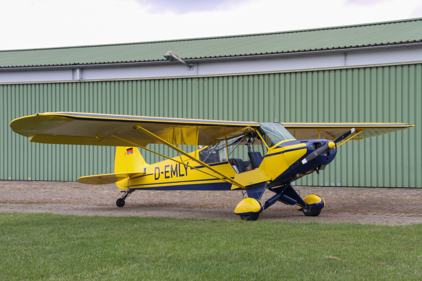 PA-18-150 vor einer Halle auf dem Flugplatz Gelnhausen (EDFG) am 15.10.2023