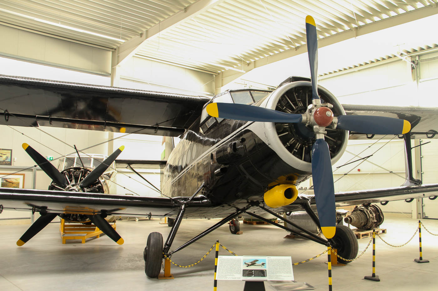 Antonov AN-2, Flugfähiges Exemplar, seit 2005 im Museum. Länge 12,74 m, Spannweite 18,18 m, Leergewicht 3450 kg, Startgewicht 5500 kg, Reichweite 1390 kn, Dienstgipfelhöhe 4400 m, 190 km/h, Motor Asch-62IR mit 735 kW, Baujahr 1958.