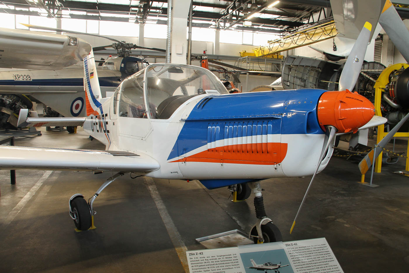 Zlin Z-42, Länge 7,07 m, Spannweite 8,6 m, Leergewicht 685 kg, Startgewicht 970 kg, Reichweite 530 km, Dienstgipfelhöhe 4250 m, 315 km/h, Avia M137 A Motor mit 132 kW, Baujahr 1977.
