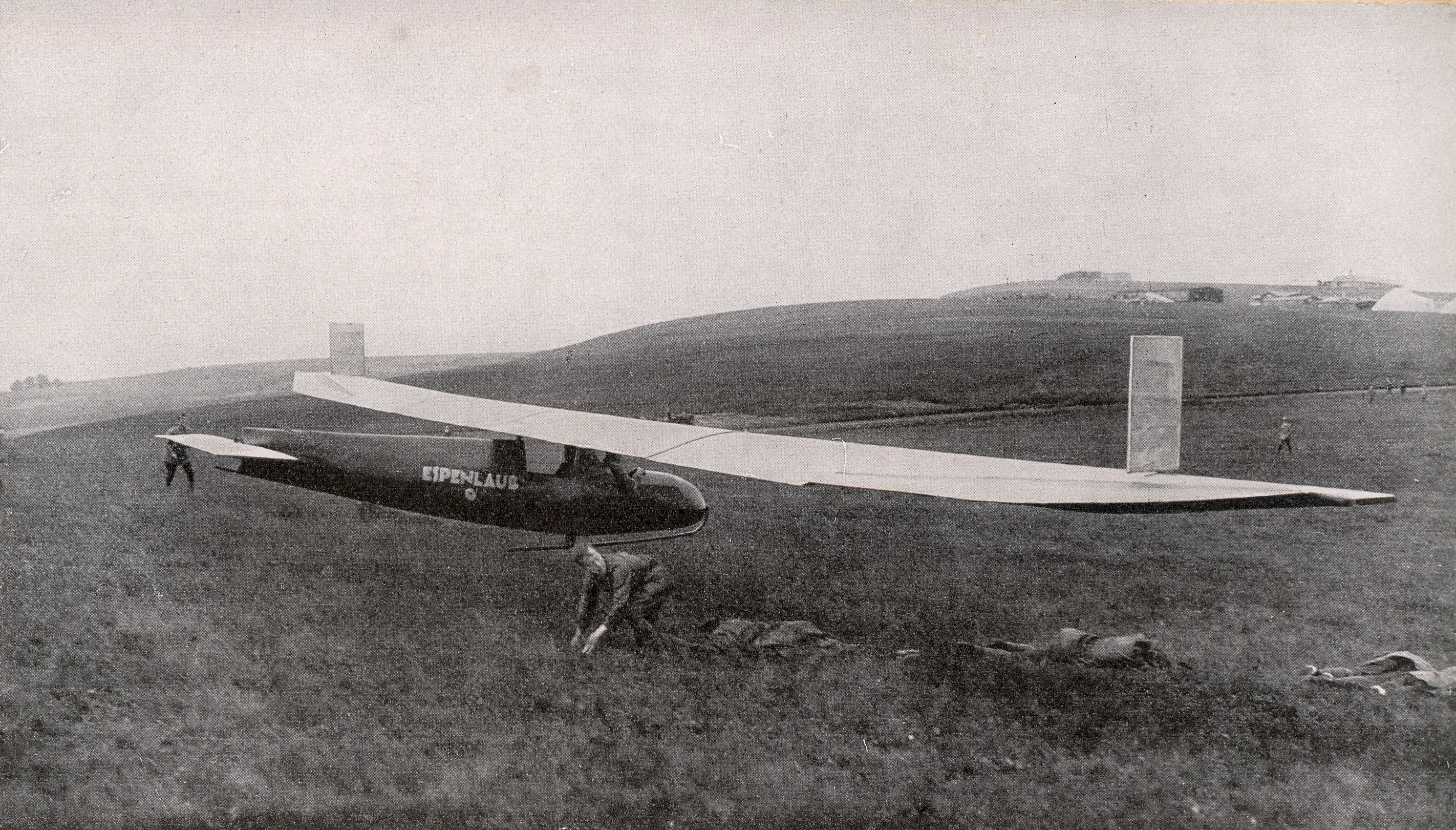 Espenlaubs Riesenflugzeug (24 Meter Spannweite) beim Start auf der Rhön. Die Startmannschaften haben sich zu Boden geworfen, rechts unter der Tragfläche. Oben rechts das Fliegerlager im Jahr 1926.