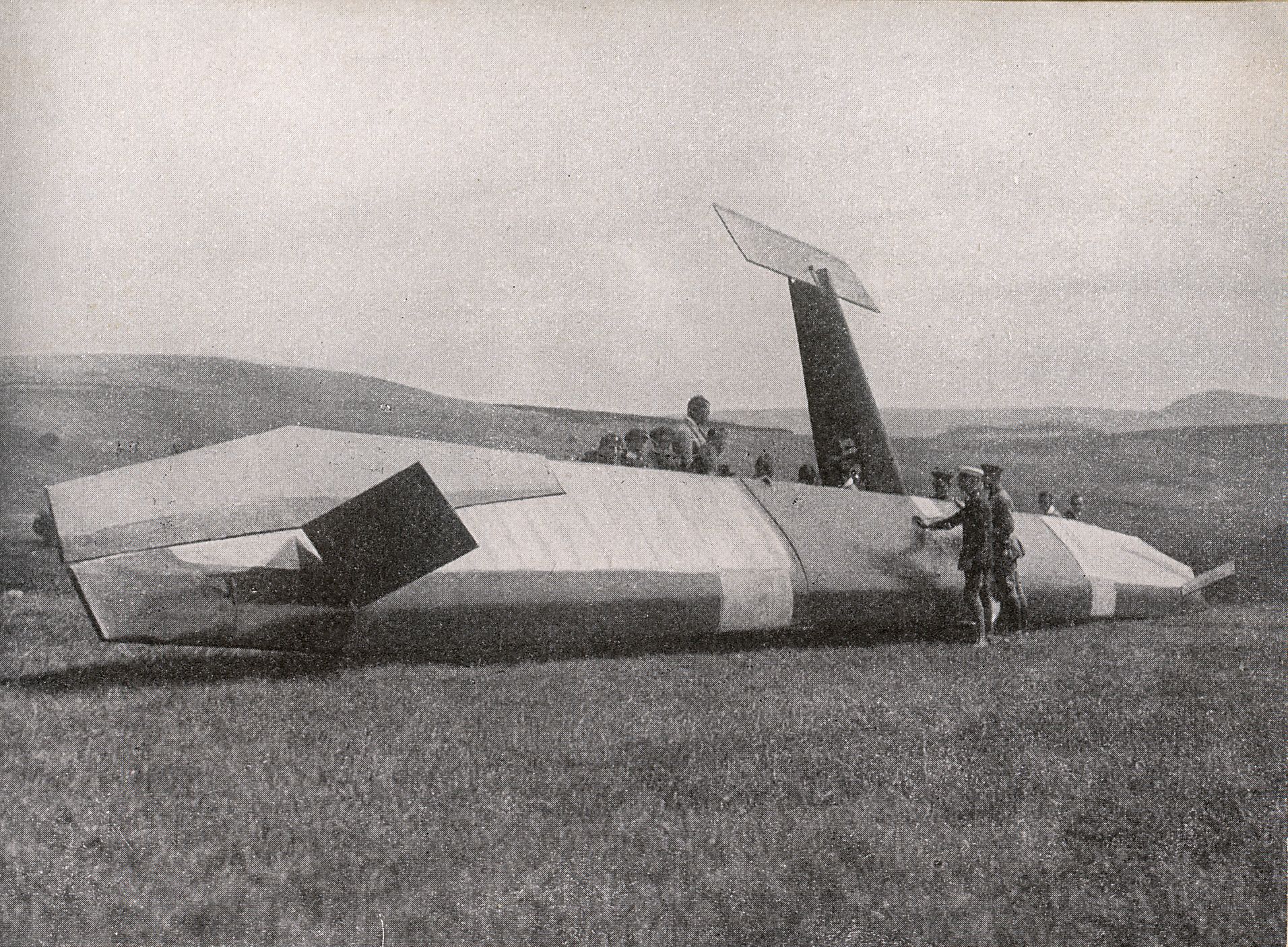 Kopfstand des Espenlaub Riesenflugzeuges auf der Rhön 1926.