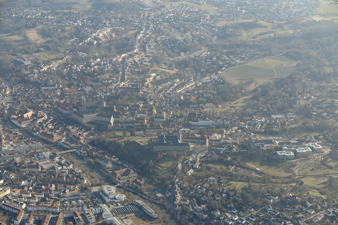 Luftbild am 28.02.2021, Bamberg mit Dom und Kloster bei viel Feuchtigkeit in der Luft