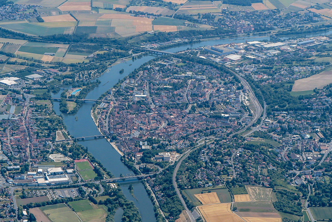 Luftbild Kitzingen am 21.6.2025, Maininsel mit Freibad und die Altstadt
