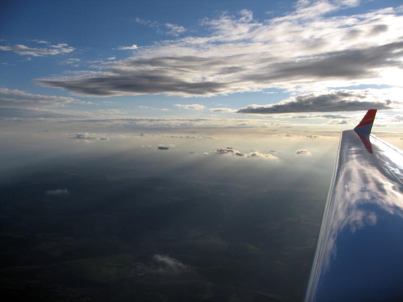 Sehr schöne Wolkenspiegelung auf der rechten Fläche des Motorseglers beim abendlichen Flug über der Rhön.