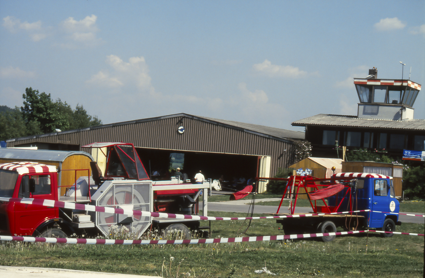 Startwinde und Seilrückholwagen vor dem Hangar und dem Clubheim auf dem Grasberg.