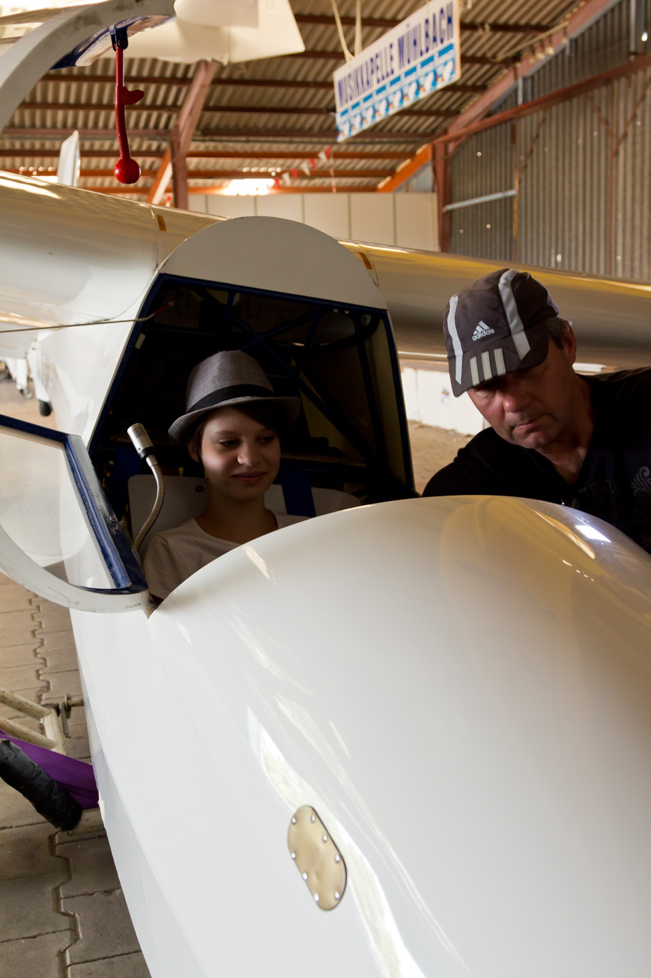 Interessentin an einer Flugschülerausbildung beim Probesitzen mit Fluglehrer Andi