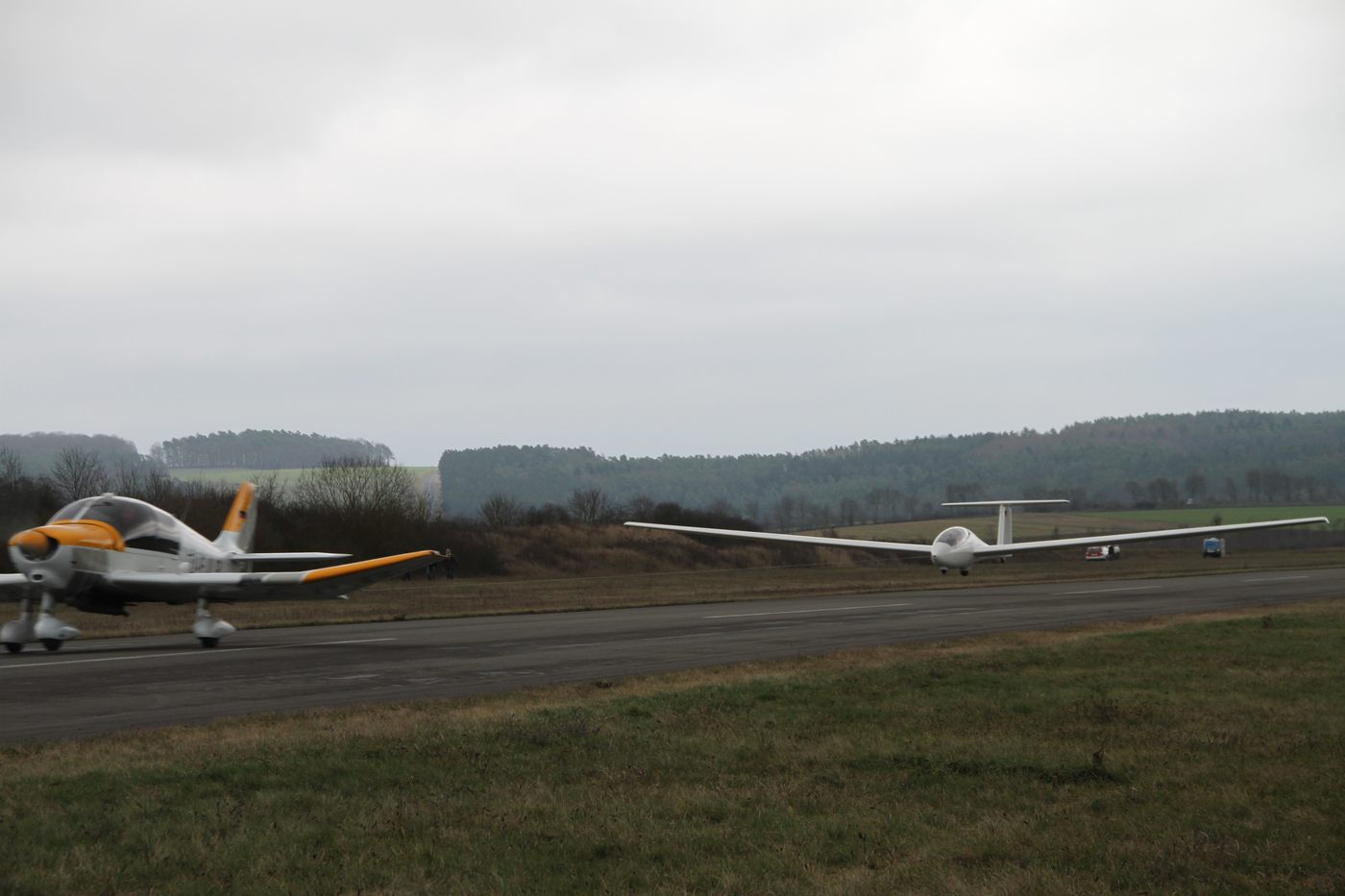 Schleppzug mit G103 Twin, dieser ist bereits abgehoben und das Motorflugzeug rollt noch.