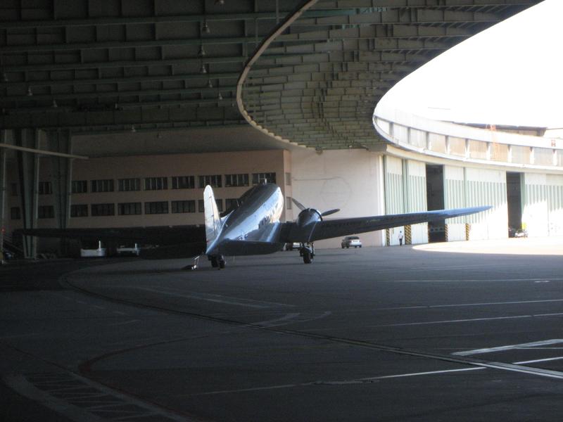 Flughafen Tempelhof mit DC 3 unter dem Hallenvordach