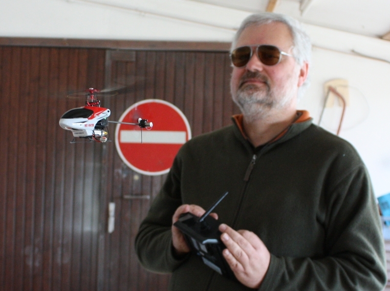 Mini-Hubschrauber wird von Uli in Segelflugwerkstatt vorgeflogen