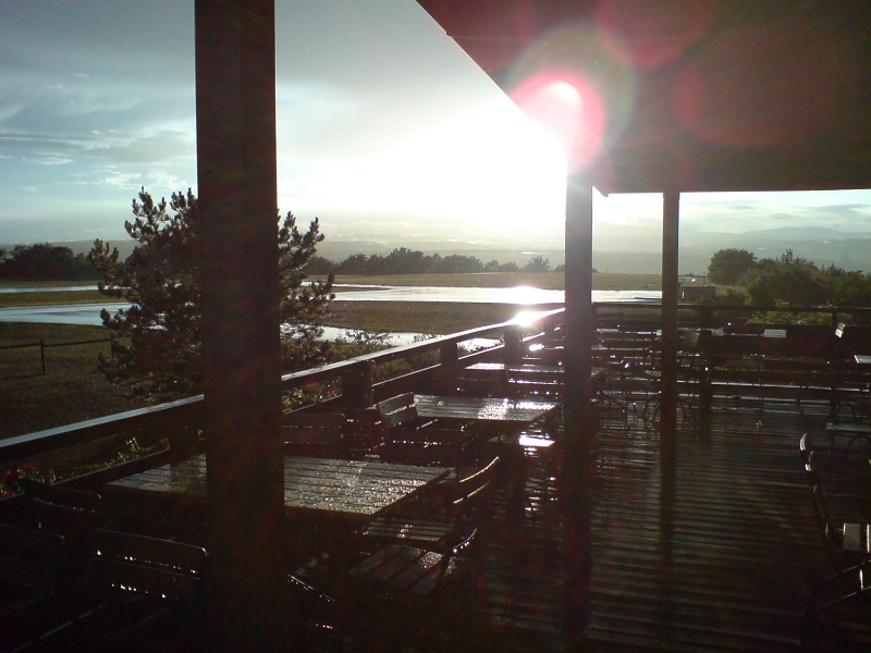 Gegenseite, Licht und Regen auf dem Clubheimbalkon