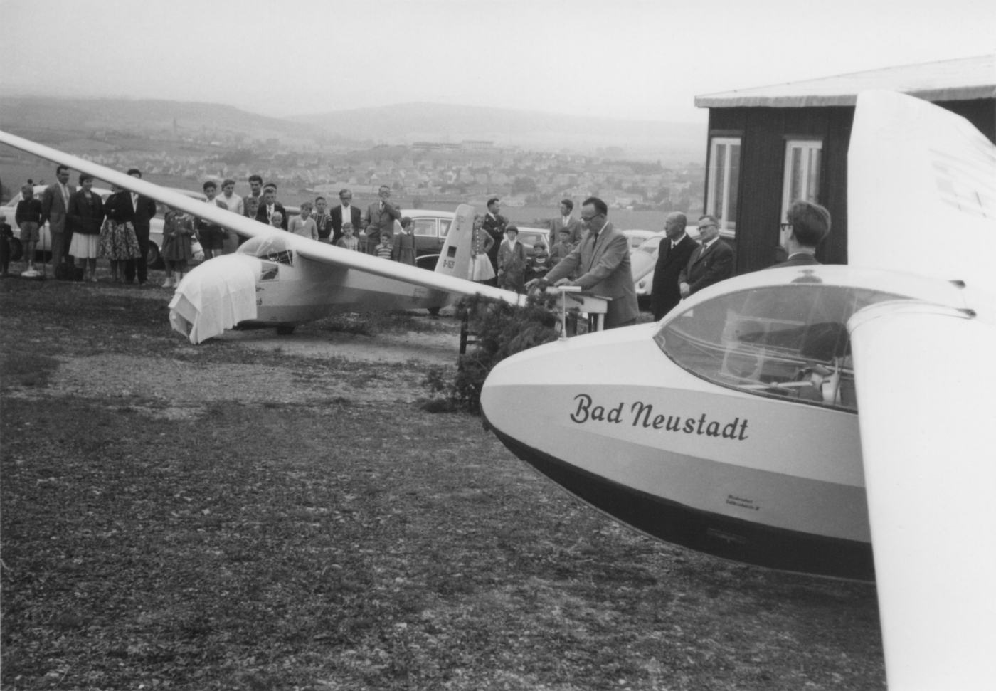 ein ein- und ein doppelsitziges Segelflugzeug auf dem Grasberg, im Hintergrund ist der "Schulberg" erkennbar, vorn Rhönlerche, hinten Ka 8