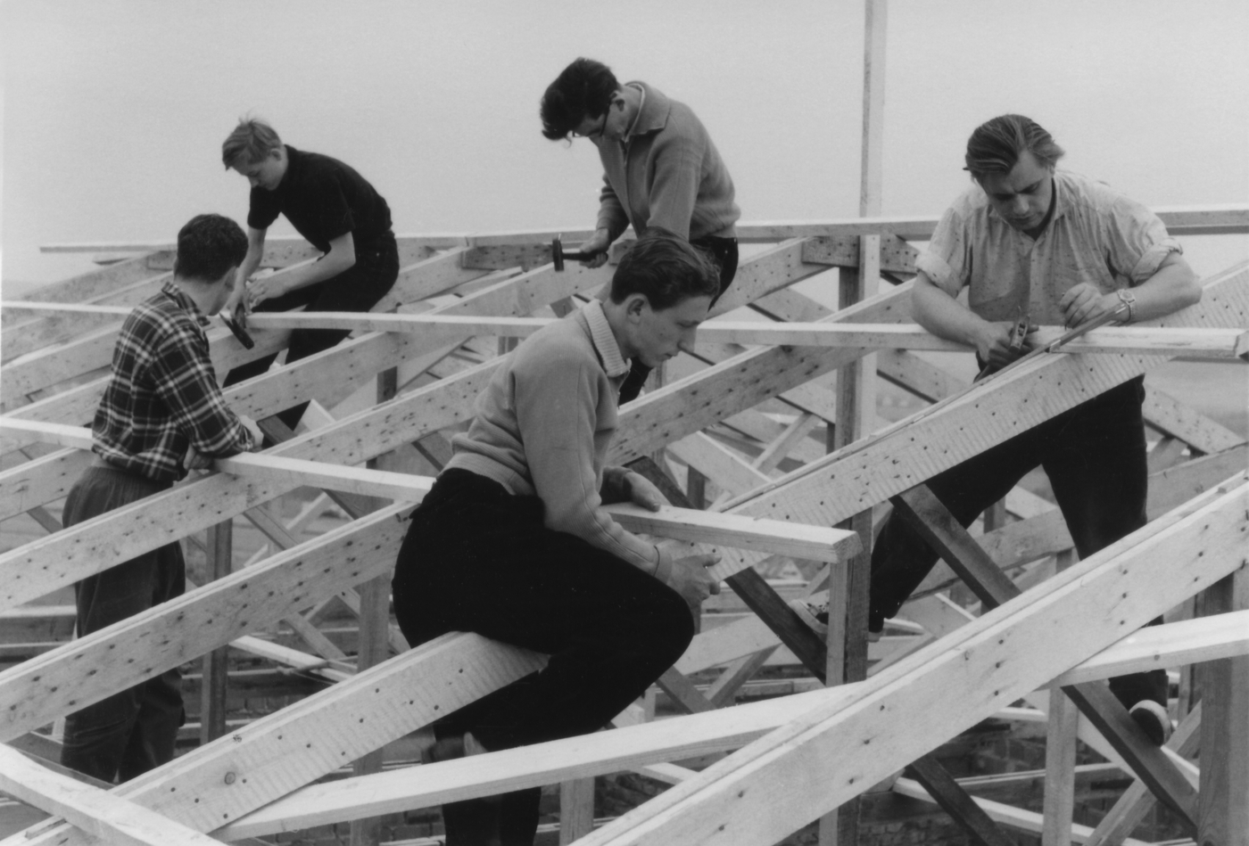 das Hallendach der heutigen Fahrzeughalle wurde offensichtlich in Eigenleistung erbaut, ganz rechts Eberhard Hanusch, links daneben Werner Jordan