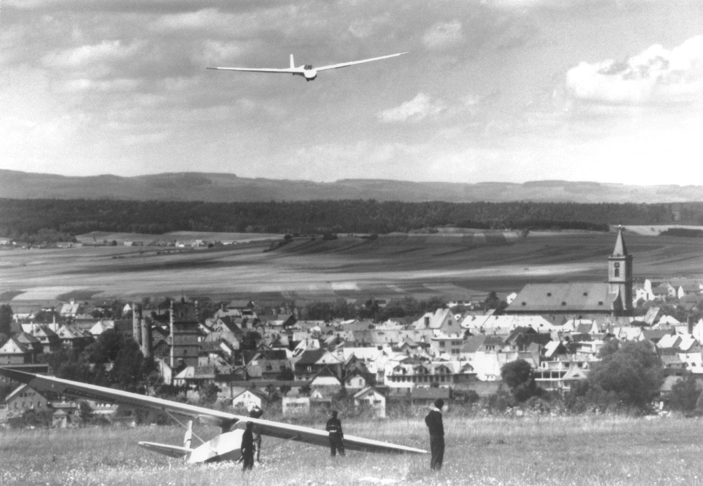Endanflug eines Segelflugzeugs (Bergfalke) auf den Grasberg in der heutigen Richtung 13, ein weiteres steht im Gras (Grunau Baby III), die Altstadt von Bad Neustadt ist erkennbar, Aufnahme soll aus den 60ziger Jahren stammen